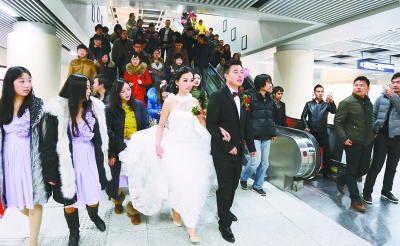 昨天,一对武汉新人放弃花车游街的传统,乘坐地铁奔赴爱巢。新郎夏敬伟家住光谷,新娘谢蝶住在汉口水塔附近。夏敬伟一早来到水塔这边接新娘,然后两人手牵手走到江汉路地铁站,乘2号地铁过江,一直坐到终点站光谷下车。