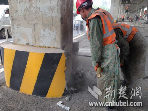 据施工方负责人介绍,沌阳高架桥有两排共计360根桥墩,桥墩高度从4米到8米不等,平均每个桥墩都要钻10到15个孔。工人在施工时发现,每个高架桥桥墩中,都有一根从桥面垂直下来的排水管,这些管道,并未出现在早前交付的设计图纸中。因此,武汉市市政集团又调集其下属的城建公司、桥梁公司及隧道公司来共同作业,首先为排水管灌浆再行钻孔,确保爆破效果。