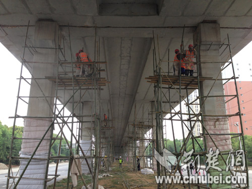 23日上午,记者在施工现场看到,全长3476.5米的高架桥已经禁止通车。施工方(武汉市市政建设集团爆破公司)的工人们正在桥下施工作业,给桥墩钻孔,为填装炸药做准备。同时,不少已经钻好孔的桥墩,已经用棉絮和钢丝网包裹起来,仅留下洞口用以填充炸药。
