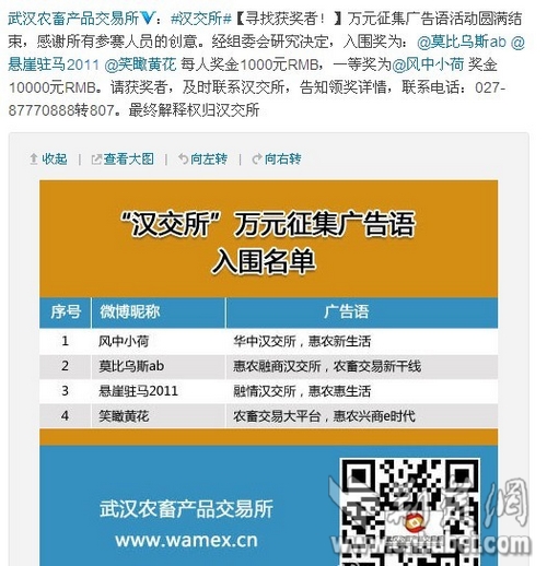 截至目前,经网友投票和组委会研究决定,入围奖为:@风中小荷 @莫比乌斯ab、@悬崖驻马2011、@笑瞰黄花,每人奖金1000元,一等奖为@风中小荷 奖金1万元。汉交所提醒获奖者,及时与汉交所工作人员联系,以便告知领奖详情。联系电话:027-87770888转807。