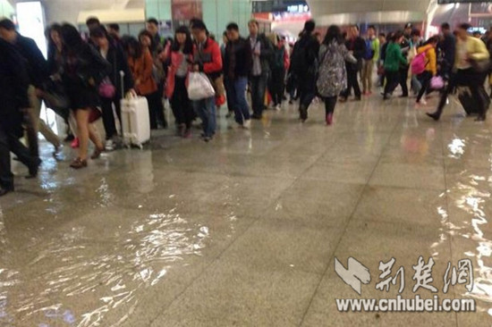 昨夜,今年最猛烈的雷雨天气突袭江城。网民纷纷在微博中贴出武汉各路段“海景图”,渍水照片显示:武汉站北出站口内外都出现积水,旅客出行受阻,部分出口积水甚至需要乘客脱鞋才能出入。