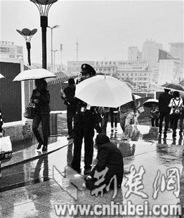 昨日上午11时许,市民王先生经过光谷步行街时,看见一名乞讨者坐在地上,一名保安手撑雨伞,为乞讨者遮雨(如图),便用手机拍下这一幕,并发微博说“武汉还是比较有爱的”。一些网友看到后,不仅纷纷点赞,还有网友留言称赞:“这是中国好保安”。