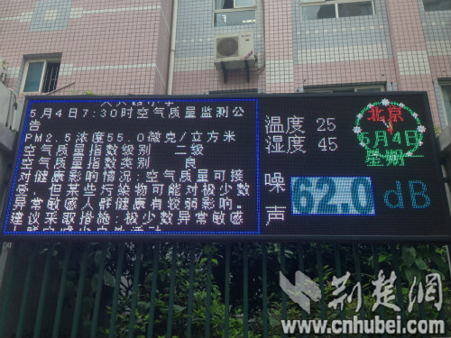 荆楚网消息(记者 徐芳)“PM2.5浓度:55.0微克/立方米,空气质量指数:二级,空气质量指数类别:良。”江汉区大兴路小学,在靠近汉正街的闹市中校园并不起眼。但校门口的一块电子屏,每天早晚发布当日空气质量状况,吸引路过的行人驻足观看,彰显出这所小学的“绿色”特点。