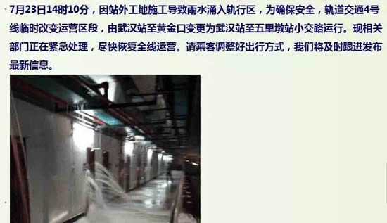 据@武汉地铁运营:因站外工地施工导致雨水涌入轨行区,为确保安全,轨道交通4号线临时改变运营区段,由武汉站至黄金口变更为武汉站至五里墩站小交路运行。现相关部门正在紧急处理,尽快恢复全线运营。请乘客调整好出行方式。