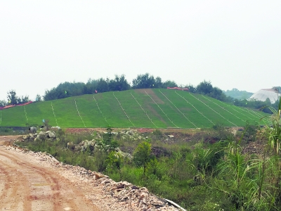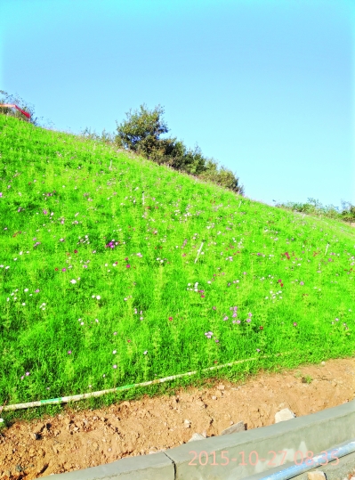 为了复绿,施工方想尽办法。缓坡填方后种树,共种了5万棵。陡坡上张挂三维铁丝网,用喷枪喷上掺有植物种子的泥土。为形成生态,掺入的植物种子有马尾松、乌桕等10多种。“天气暖和,植物生长,两年后就能与周围植被相融合,四季都有花开”,陈凯说。