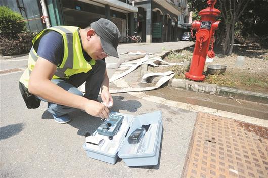 昨日上午,记者正好遇到在小区检修泵站和检测水样的市水务集团武昌供水部的多位工作人员。水务人员打开小区内的消防栓,用两个专用小瓶子取了水样,放在专业仪器上检测。