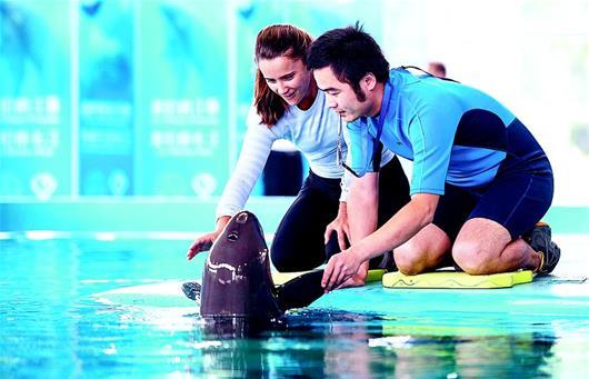 美国新星劳伦·戴维斯(左)与江豚亲密接触。 (记者 时龚 摄)