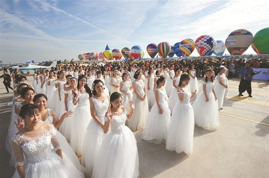 百对新人中,有一对编号100的外国夫妻格外引人注目。就在婚礼前两天,新郎尼克和新娘尚恩,和其他43位来自全球10个国家的队友从武汉上空跳下,摆成了五角星阵形,创造了中国的跳伞纪录。