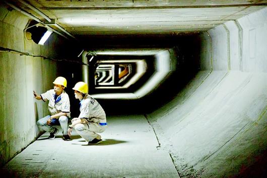 图为:隧道工作人员在逃生通道进行结构安全检查