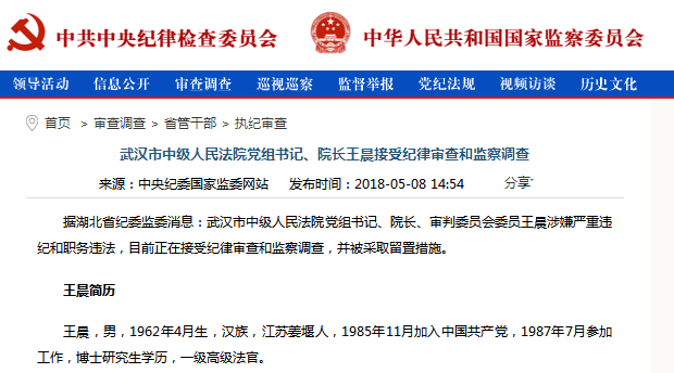 据湖北省纪委监委消息:武汉市中级人民法院党组书记、院长、审判委员会委员王晨涉嫌严重违纪和职务违法,目前正在接受纪律审查和监察调查,并被采取留置措施。