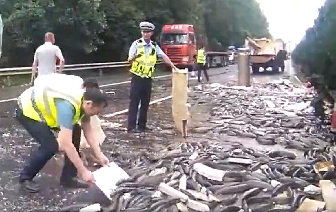7月8日消息,5日,武汉一货车在高速公路上打滑,3000斤鱼洒满高速,道路受阻。民警迅速帮忙收拾,有的过路司机想“趁火打劫”被民警当场批评。一小时后现场恢复正常。来源:未来网