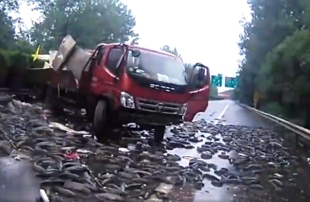 司机表示,当时超车道有两个大货车,它看到我到它尾这边突然超车,表示自己来不及了。一踩刹车,车子一滑发生了侧翻事故。