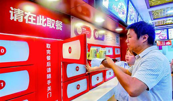图为消费者从取餐箱取食物