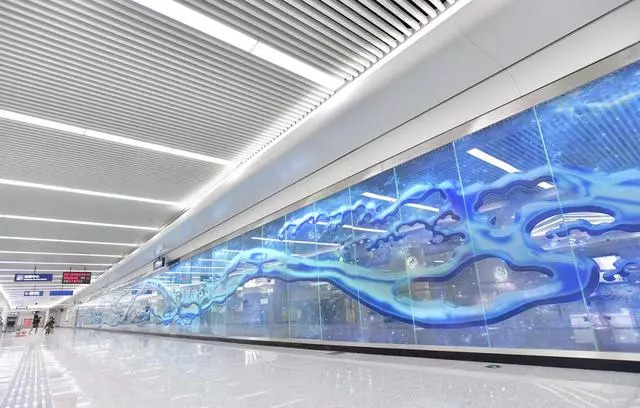 地铁7号线螃蟹岬站艺术墙创作主题为“璀璨星河、沧海艺粟”,画面中奔腾不息的星河犹如楚凤翱翔于九天之上,艺术大家闪耀其中,艺术之源生生不已。记者李永刚摄(信息来源:袁永华)