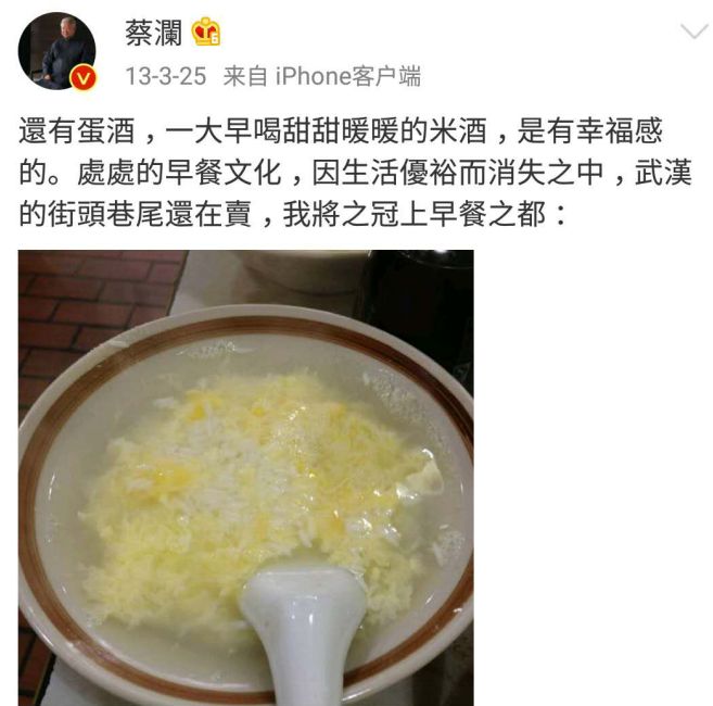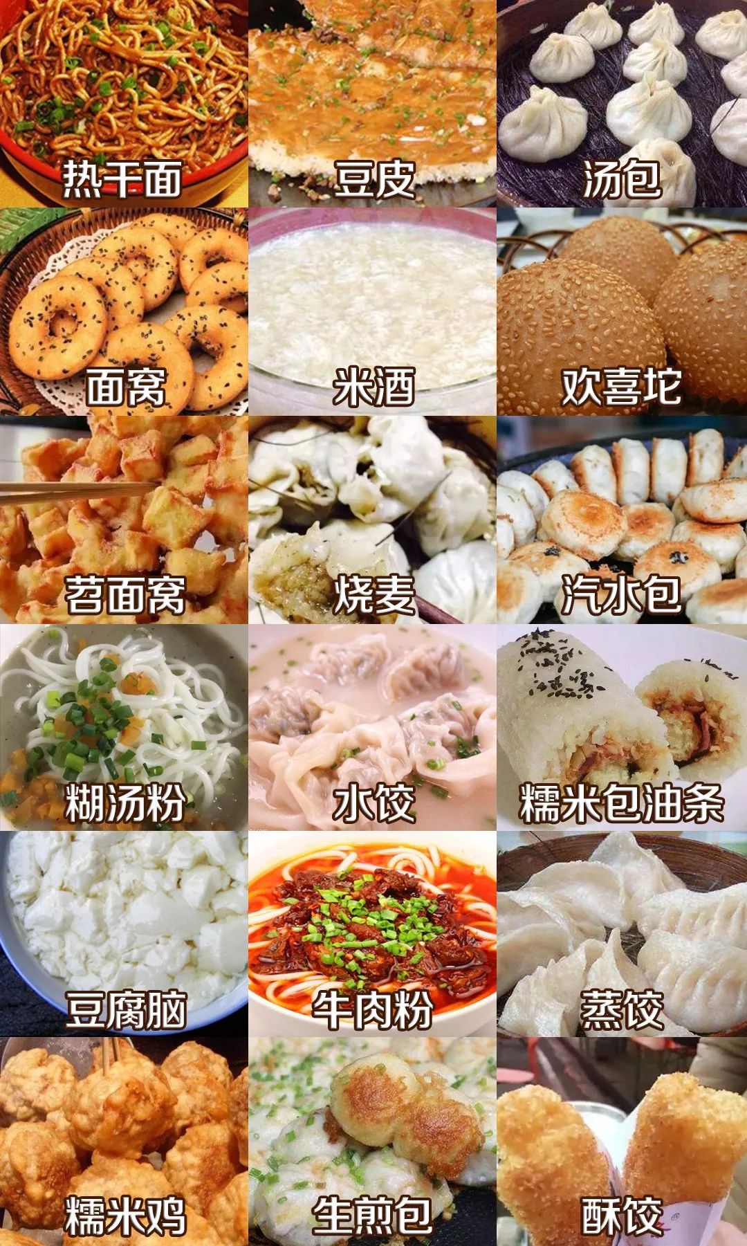 生活在武汉的作家池莉曾在作品中盘点过武汉的早餐:“老通城的豆皮,蔡林记的热干面,谈炎记的水饺,田恒启的糊汤米粉,厚生里的什锦豆腐脑,一品香的一品大包,老谦记的牛肉枯炒豆丝,民生食堂的小小汤圆,五芳斋的麻蓉汤圆,同兴里的油香,顺香居的重油烧梅,民众甜食的汰汁酒,福庆和的牛肉米粉……”
