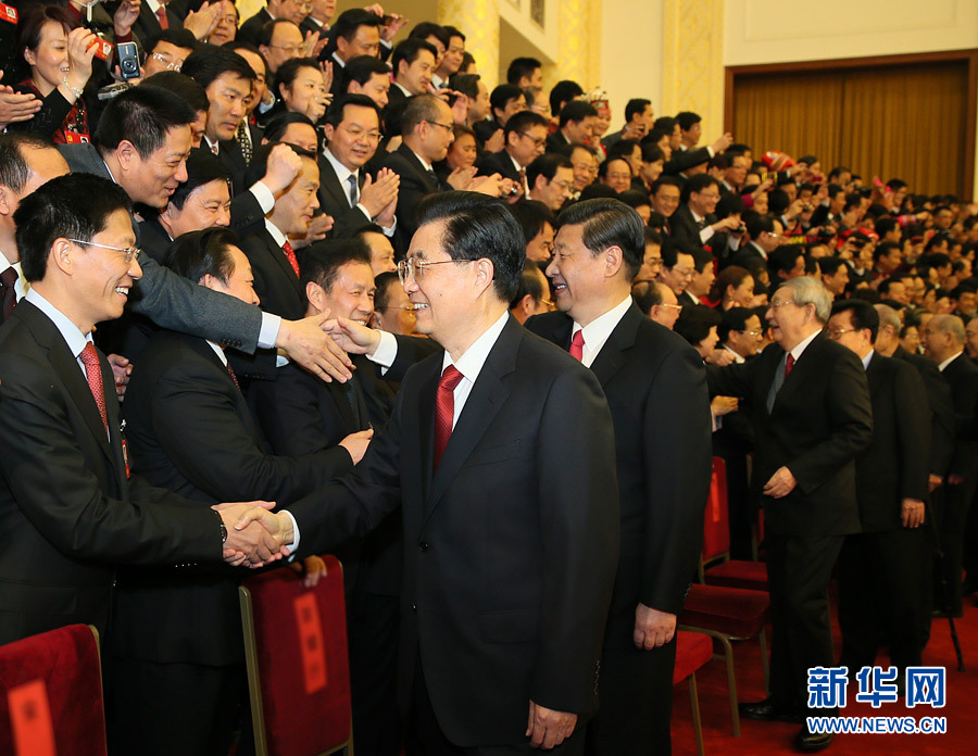 11月15日,国家主席胡锦涛,新当选的中共中央总书记、中共中央军委主席习近平等领导同志在北京人民大会堂亲切会见出席党的十八大代表、特邀代表和列席人员并发表重要讲话。新华社记者鞠鹏摄