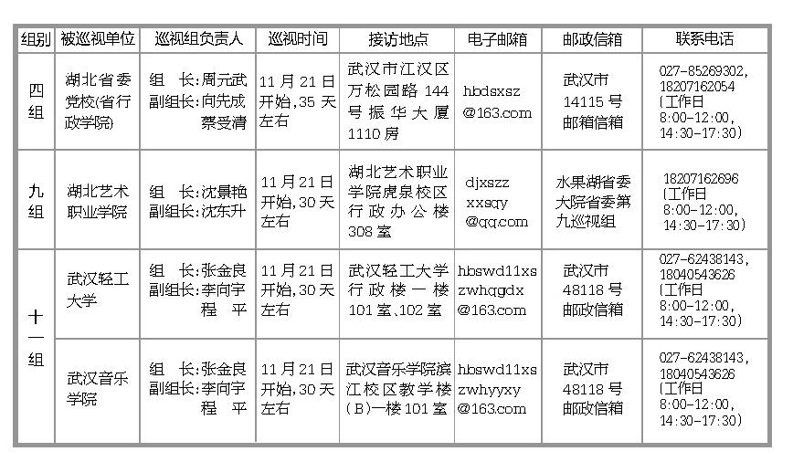 湖北日报讯 (记者杨宏斌、通讯员王婧)根据省委统一部署,21日,省委第四、第九、第十一巡视组分别进驻省委党校 (省行政学院)、湖北艺术职业学院、武汉轻工大学、武汉音乐学院开展巡视,并召开了巡视工作动员会。