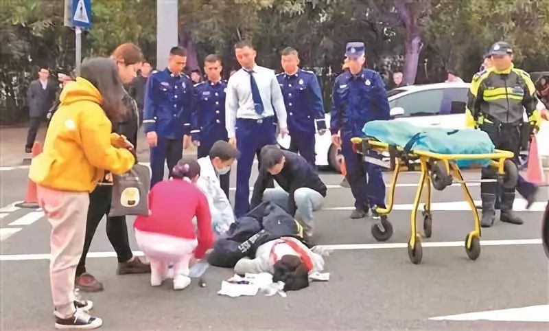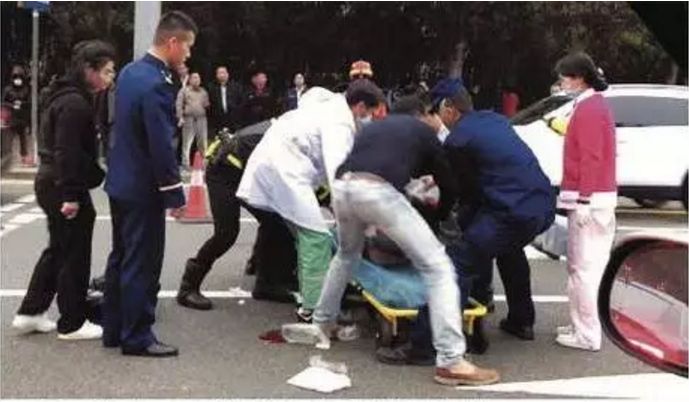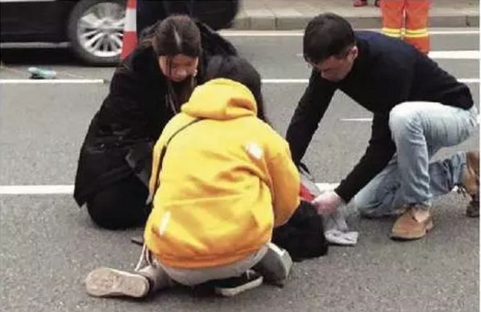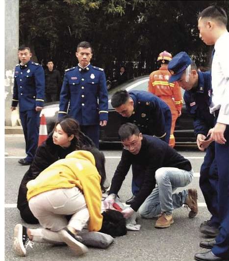谭志明(戴眼镜男子)跪地为伤者清理口鼻中的呕吐物 受访者供图