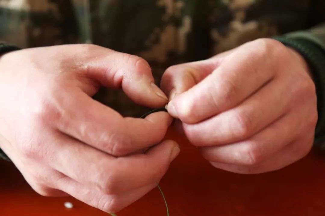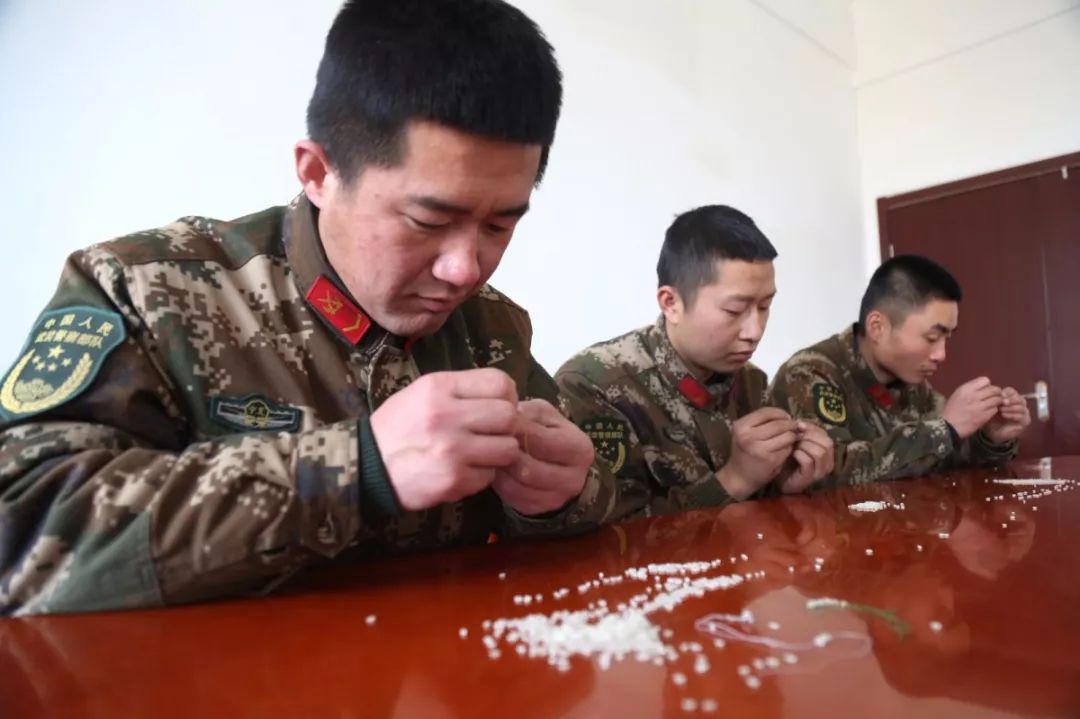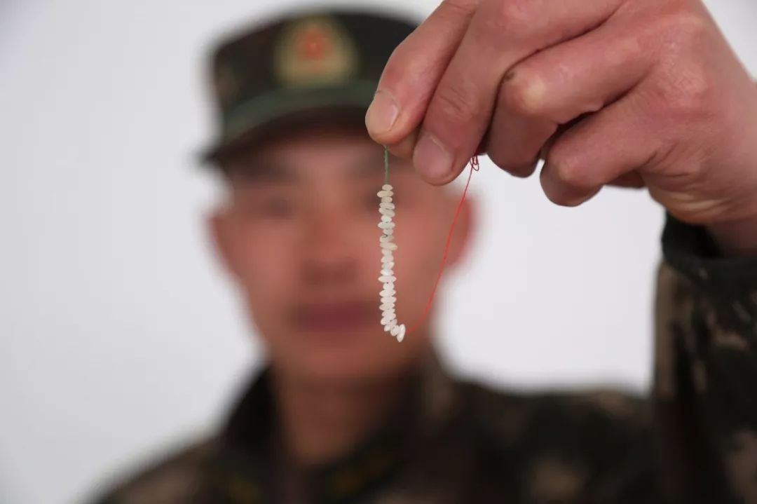△特战分队副队长冯猛展示在米粒上穿线的功夫。