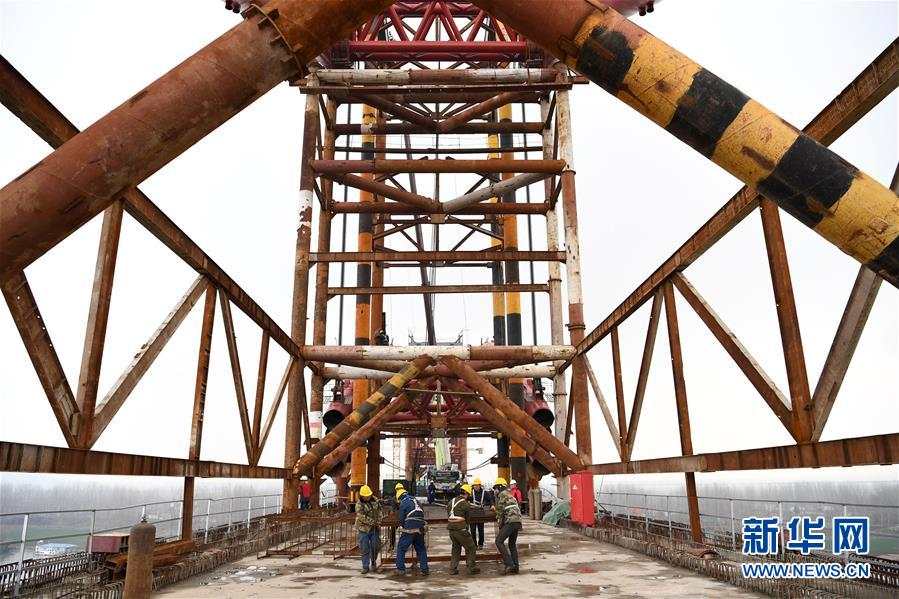 2月27日,施工人员为商合杭铁路跨淮河特大桥钢管拱提升合龙做施工准备。(图片来源:新华网)