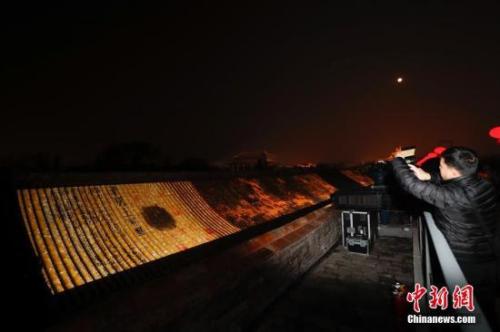 资料图:2月19日晚,以艺术灯光形式投影于古建屋顶上的《清明上河图》。中新社记者 杜洋 摄