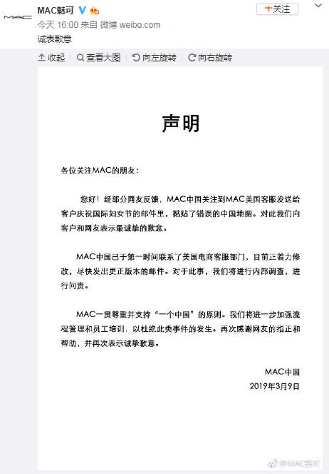 9日下午,MAC中国官方微博发布一则声明,经部分网友反馈,MAC中国关注到MAC美国客服发送给客户庆祝国际妇女节的邮件里,黏贴了错误的中国地图,对此表示歉意。MAC中国已于第一时间联系了美国电商客服部门,目前正着力修改,尽快发出更正版本的邮件,对于此事,公司将进行内部调查,进行问责。