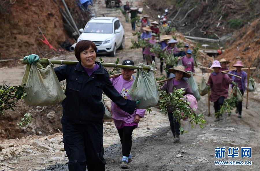 3月13日,在广西三江侗族自治县丹洲古篮千亩油茶基地,当地群众在搬运水泥浆修建基地内的道路。新华社记者 陆波岸 摄