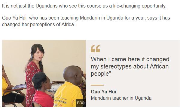 另一名受训者, 特维贝泽(Praise Twebaze)同穆罗科瓦有着相同的想法。他还希望学会中文后,能到更多地方去旅行。“我们不仅可以去使用英语的地方,还可以去说中文的地方了。”