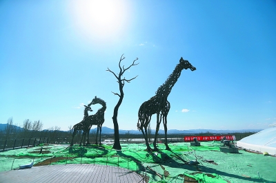 从植物温室内的弧形步道攀爬至顶层,便可一眼看见东南角屹立的庞然大物——“莫莉和她的一家人”。这是一组枯木雕塑艺术作品,出自英国艺术家詹姆斯·多兰·韦伯之手,这是他为2019年北京世园会植物馆专门创作的作品,也是世界上最大的枯木动物雕塑。这组装置高10米,由小长颈鹿、公长颈鹿、母长颈鹿和金属树四部分组成,设计师为小长颈鹿起名莫莉,所以这组作品也就得名“莫莉和她的一家人”。