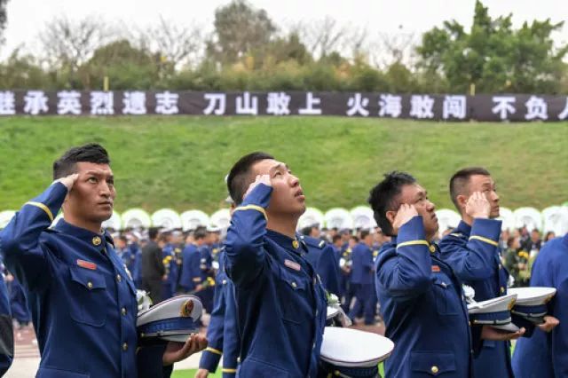 4月4日,参加悼念活动的森林消防员向牺牲的队友敬礼。 新华社记者 张超群 摄