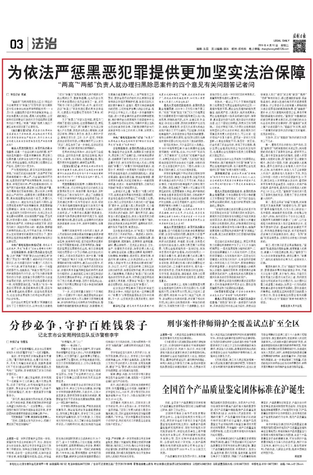 随着扫黑除恶专项斗争的深入推进,进入司法程序的涉黑涉恶案件数量也将逐步增加,有律师反映,以往办理刑事案件中遇到的会见难、阅卷难等问题,在办理涉黑涉恶案件中也不同程度地存在。还有律师反映,随着一些新型黑恶犯罪案件的出现,相关法律适用问题也需要进一步予以明确。这次出台的四个意见,内容涉及黑恶势力、财产处置、“软暴力”“套路贷”等多个方面,对于司法实践具有很强的针对性与指导性。意见出台过程中,司法部组织多个相关内设厅局进行逐条研究论证,并组织具有丰富刑辩经验的律师代表进行专题研讨,认真梳理汇总相关意见和建议后及时反馈给起草单位,并就意见和建议进行了充分沟通。我相信,这四个意见的出台,有利于为开展扫黑除恶专项斗争提供明确具体的法律指引。