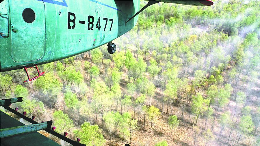 4月14日,一架农用飞机在第一师10团防风林带上空喷洒杀虫剂。自4月上旬以来,兵团对叶尔羌河、塔里木河流域的第一师、第二师和第三师的35万亩野生胡杨林和人工林实施飞防,有效控制食叶害虫对野生胡杨林和人工林的危害。 王志清摄