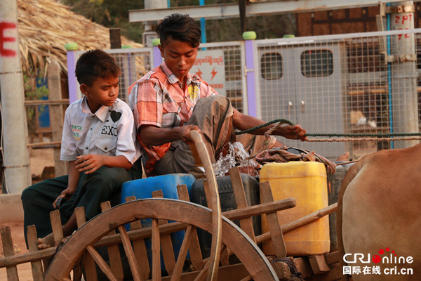 皎勃东地区的村民赶着牛车来中缅油气管道项目援建的水井打水(洪荃诠 摄)