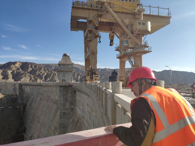 一名科幻作家在龙羊峡水电站的大坝上参观。新华社王秀琼摄