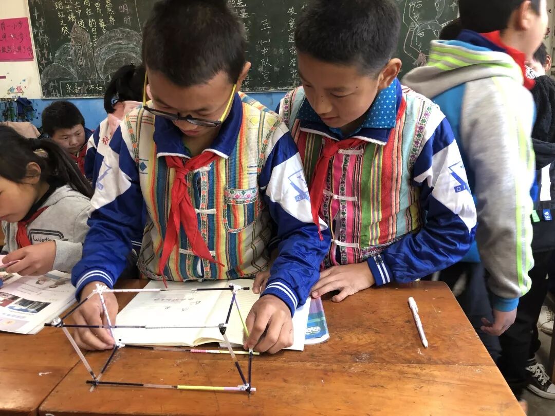 一年级一班的小学生们,正在用手比划着“秋天”的字形。旁边小学五年级数学课上,同学们在用树枝、废弃笔芯、小木棍等材料 ,拼接成一个个长方体。数学尹老师说这是为了让孩子们更好计算长方体的表面积,让孩子们对立体几何有更加直观的理解。