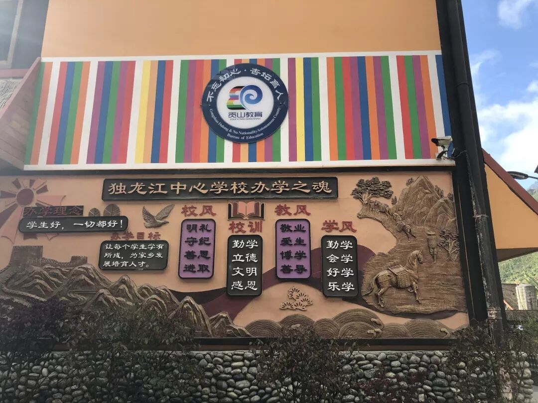 彩虹色条纹装饰的教学楼、木质茅草尖顶、随处可见的独龙牛头像