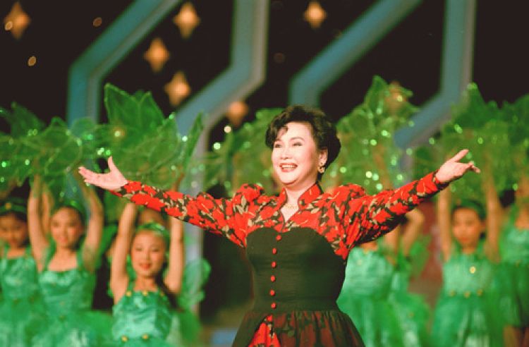著名歌唱家李谷一在演唱《我和我的祖国》。新华社记者 鞠鹏 摄(1996年7月3日发)