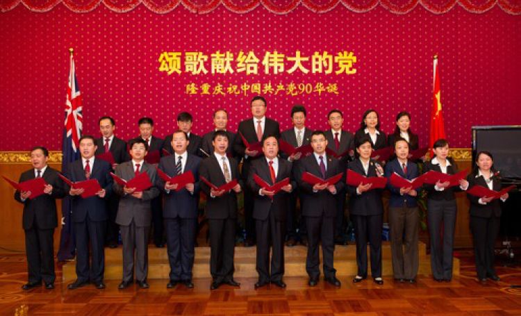 2011年7月1日,在澳大利亚首都堪培拉,中国驻澳大利亚大使陈育明(前中)与馆员们合唱歌曲《我和我的祖国》。当日,中国驻澳大利亚大使馆举办“颂歌献给伟大的党”活动,庆祝中国共产党建党90周年。新华社发(白雪摄)