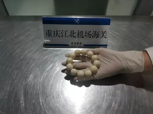 4月22日,重庆海关在江北国际机场查获1名来自缅甸仰光的中国籍男性旅客随身携带象牙饰品手串1件,重85g。目前,该案件已移送相关部门处理。
