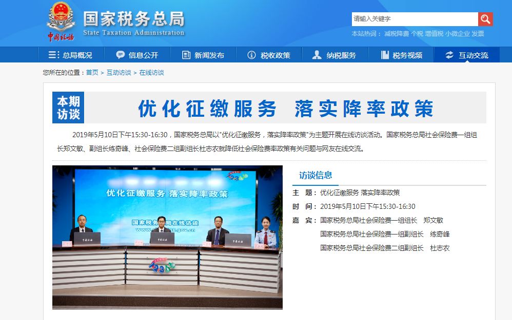 5月10日,国家税务总局就“优化征缴服务,落实降率政策”为主题开展在线访谈活动,国家税务总局社会保险费一组组长郑文敏、副组长练奇峰、社会保险费二组副组长杜志农就降低社会保险费率政策有关问题与网友在线交流。