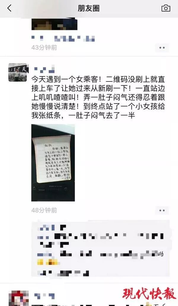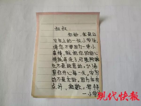 范梦茹说,当时她目睹了事件的全过程,虽然那位女乘客也不是故意的,但驾驶员受到的委屈,却是实实在在的。“我看了这一幕心里也很难受,干每一行都不容易,所以我想给叔叔写一张纸条,希望他每天都有好的心情。”
