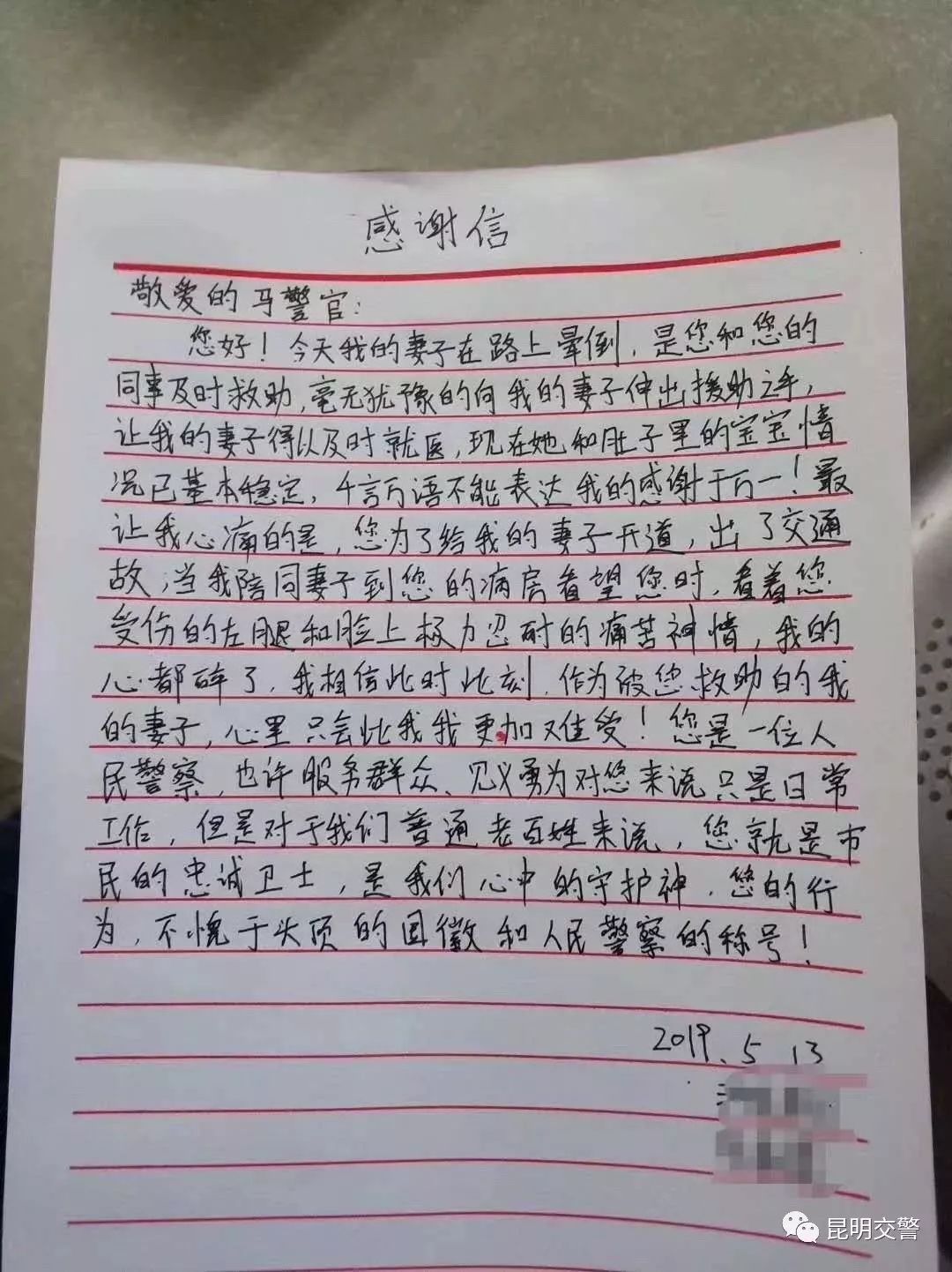 近日,云南昆明交警马立在骑警摩护送一载有孕妇的救护车去医院途中,被一辆没及时避让的出租车撞伤。 事后,孕妇及其丈夫手写了一封感谢信。 马立回复称: “别内疚,救你,我心甘情愿。 ”