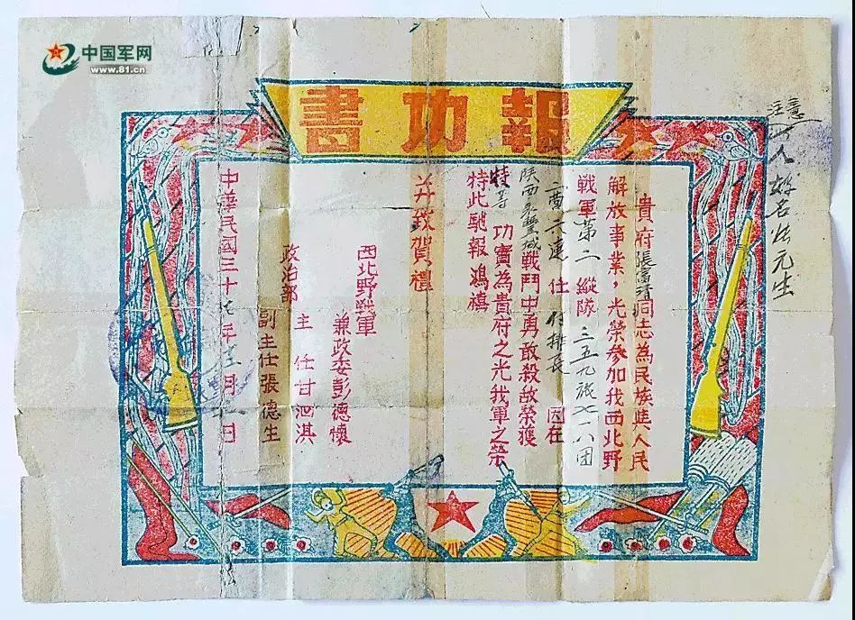 一份西北野战军的报功书