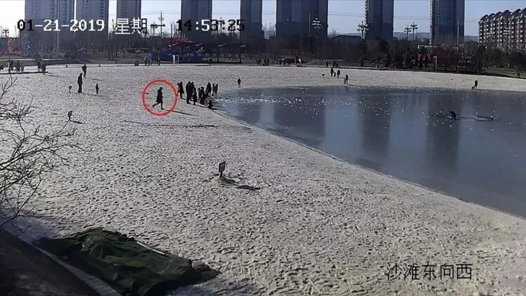 在没有找到救生器材的的情况下,李竟旋脱下外套,弯着腰半爬半跑靠近男孩,试图将其拉起。但冰面难以支撑他的重量,李竟旋也掉入寒冷刺骨的水中。