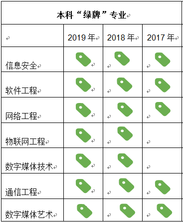 数据表明,2019年本科就业绿牌专业包括:信息安全、软件工程、网络工程、物联网工程、数字媒体技术、通信工程、数字媒体艺术。其中,信息安全、软件工程、网络工程、通信工程、数字媒体艺术连续三届绿牌。