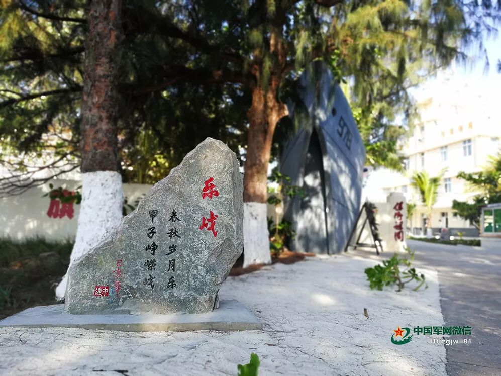 直通营区的路叫石刻路。石刻路旁有四块石刻,也就是中建岛训:忠诚、善战、乐戍、铸疆。忠诚,即忠于祖国,忠于党中央,这是中建的第一块名片;善战,即中建人不仅有爱国爱岛的赤子情怀,还有英勇顽强,敢打敢拼的血性胆气;乐戍,即中建人40年如一日坚守在祖国海防甘于牺牲奉献,以苦为荣,苦中作乐,苦中有为;铸疆,即中建人经受恶浪洗礼和白沙磨砺,立起了一块又一块丰碑,铸就起了海疆长城。