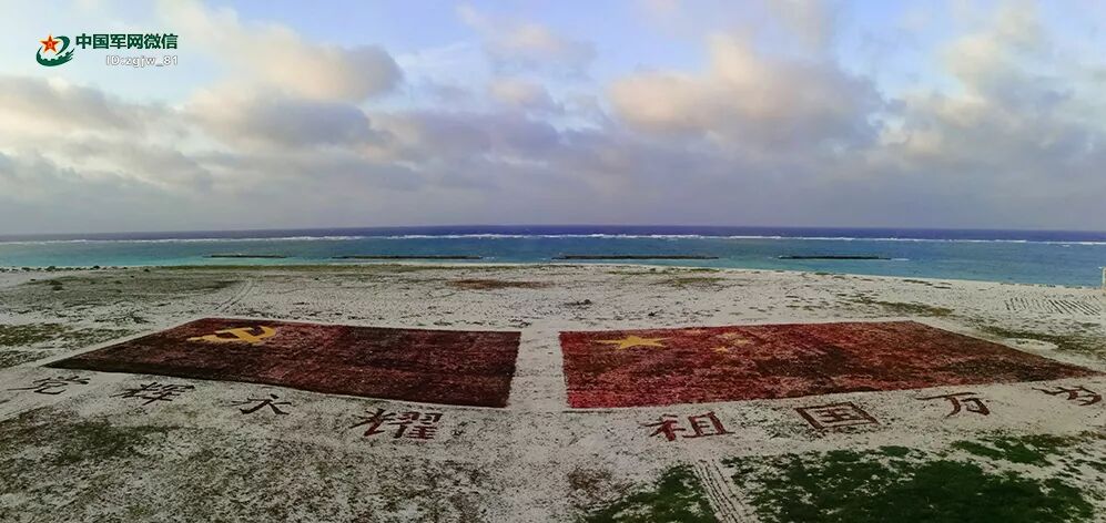 在“自建”中,最惹眼的还要数白沙滩上两面“党辉永耀”“祖国万岁”的党旗、国旗了。这两面长66M、宽44M、占地5000平方的旗帜,是官兵们利用两个月的训练间隙用海马草一点一点“种”出来的。