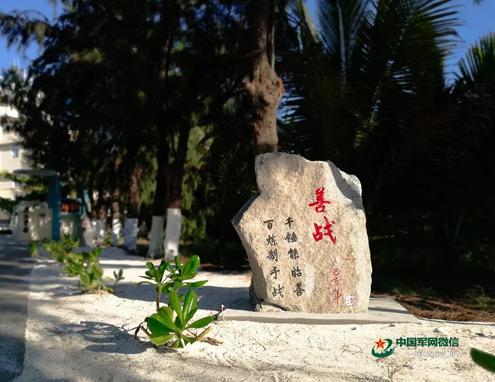 四块石刻岛训寓意深刻,激励着一代代中建人扎根守岛。你或许没有想到,这些石刻是由守备营教导员刘长文总结、发掘新人下士庄绍滨和严雨超共同雕刻的。营区内,还有之前老班长黄敏雕刻的“家”“强”“魂”“战”,“我们黄班长利用自己的休息时间,拿着简陋的工具在石头上一磨就是一中午。”