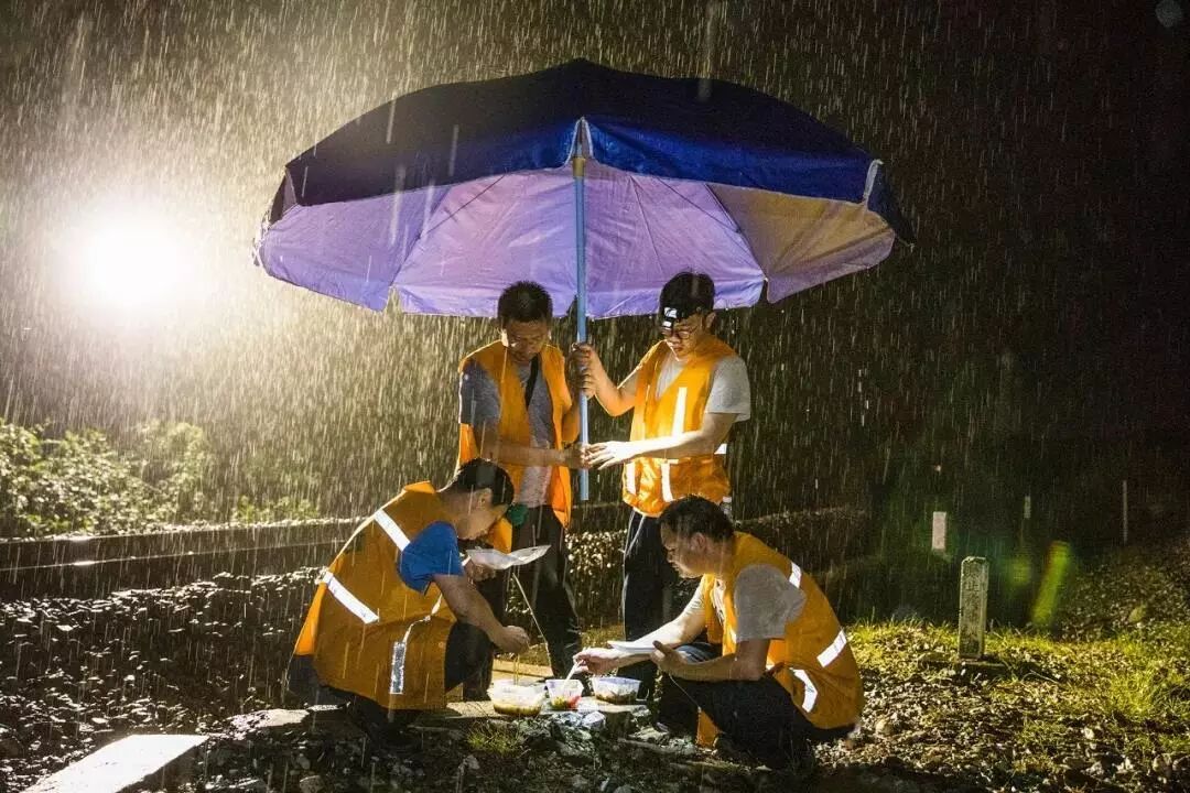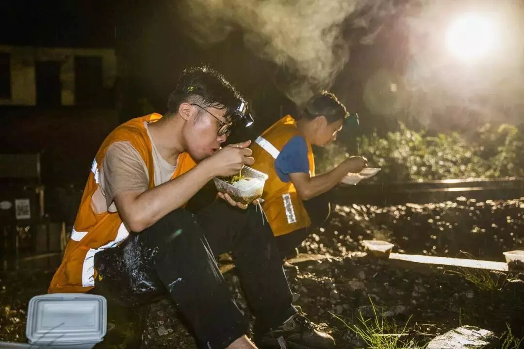 全州站内股道被洪水淹没,工作人员接到当晚开通正线的命令后,从下午4点抢修设备直至深夜,终于顺利完成了任务。此时,他们才有空匆匆吃上盒饭,在地上和衣而眠。
