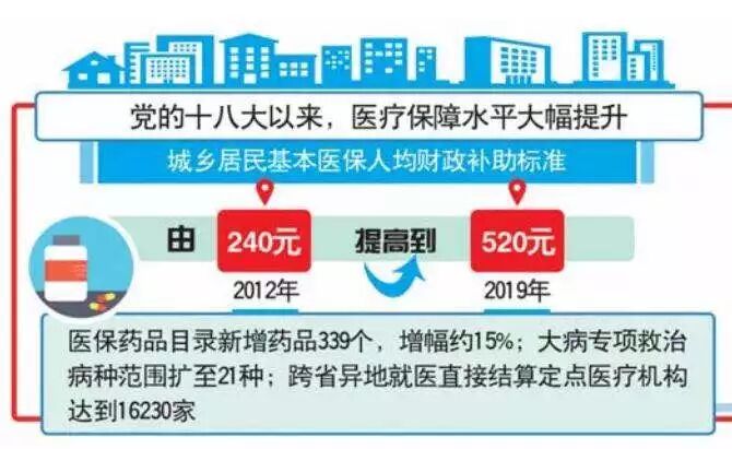 在制度指引下,医改结出累累硕果,医疗保障水平大幅提升,城乡居民基本医保人均财政补助标准由2012年的240元提高到2019年的520元;医保药品目录新增药品339个,增幅约15%;大病专项救治病种范围扩至21种;跨省异地就医直接结算定点医疗机构达到16230家。